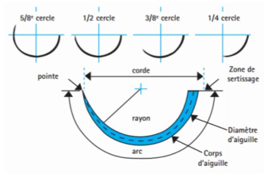 - Corps : partie sur laquelle on pose le porte aiguille. Ce corps peut être rond (tissu mou), triangulaire (tissu dur) ou lancéolé (ophtalmologie).