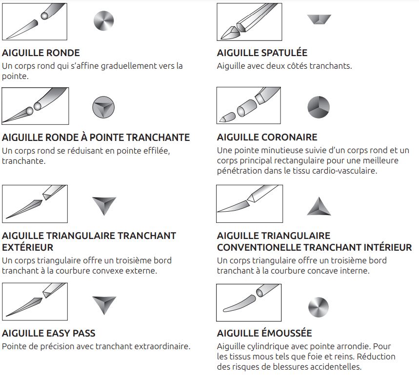 - Pointe : ronde (non tranchante, viscérale), triangulaire (pénétrante, peau/suture cutanée), diamant (tranchant à 4 côtés, tissus calcifiés), mousse (atraumatique, tissus parenchymateux).