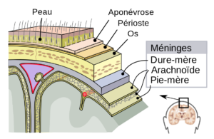 La moëlle épinière est entourée d’une membrane de protection en trois feuillets (de dehors en dedans : duremère, arachnoïde, pie-mère) composant les méninges. Elle baigne dans le liquide céphalo rachidien (LCR).