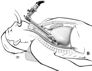 - Principe : sous anesthésie générale, introduction d’un médiastinoscope à la base du cou afin d’avoir une vu directe sur le médiastin et d’effectuer les prélèvements.